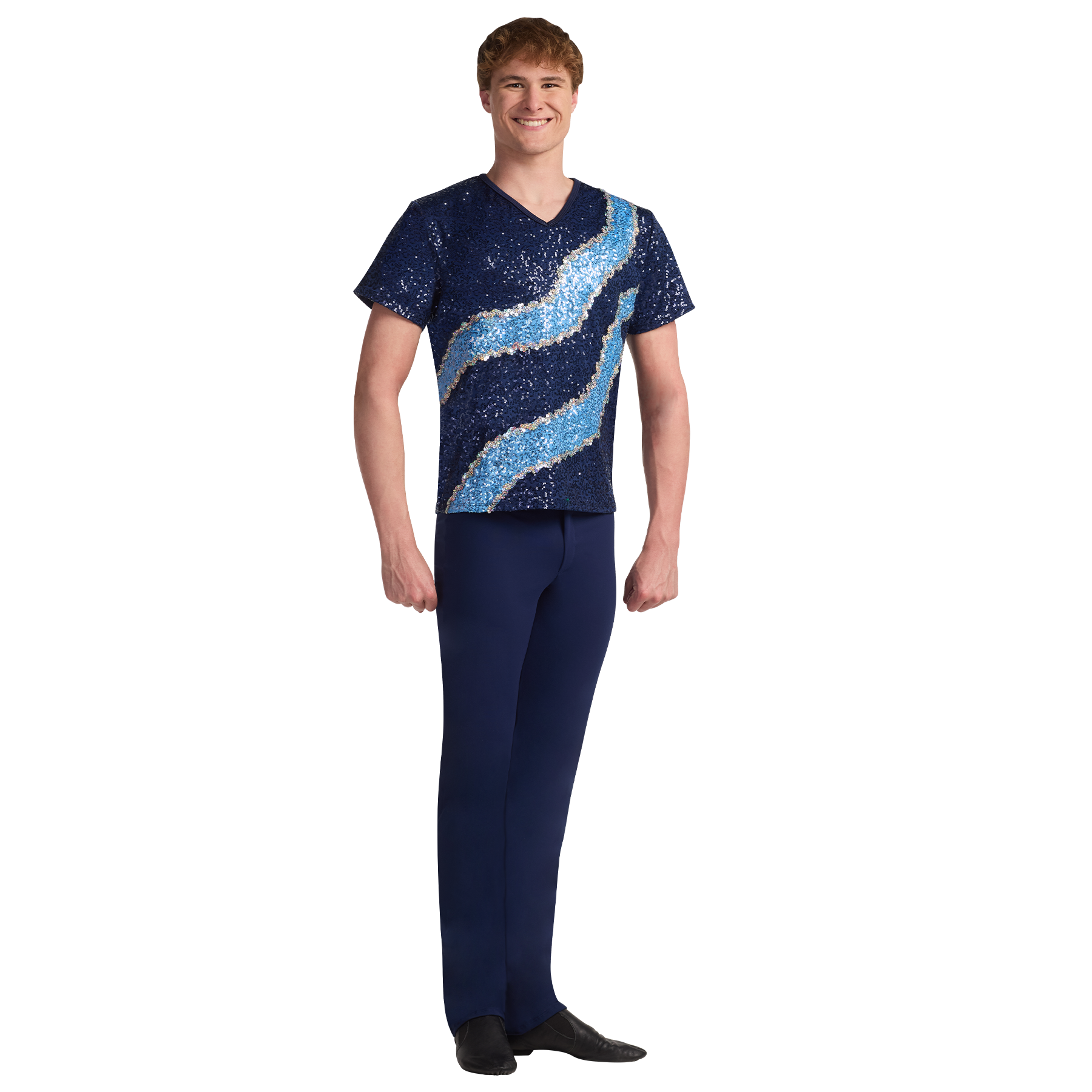 Micro sequin male top features micro sequin insets. Accented with sequin trim. Pants sold separately.