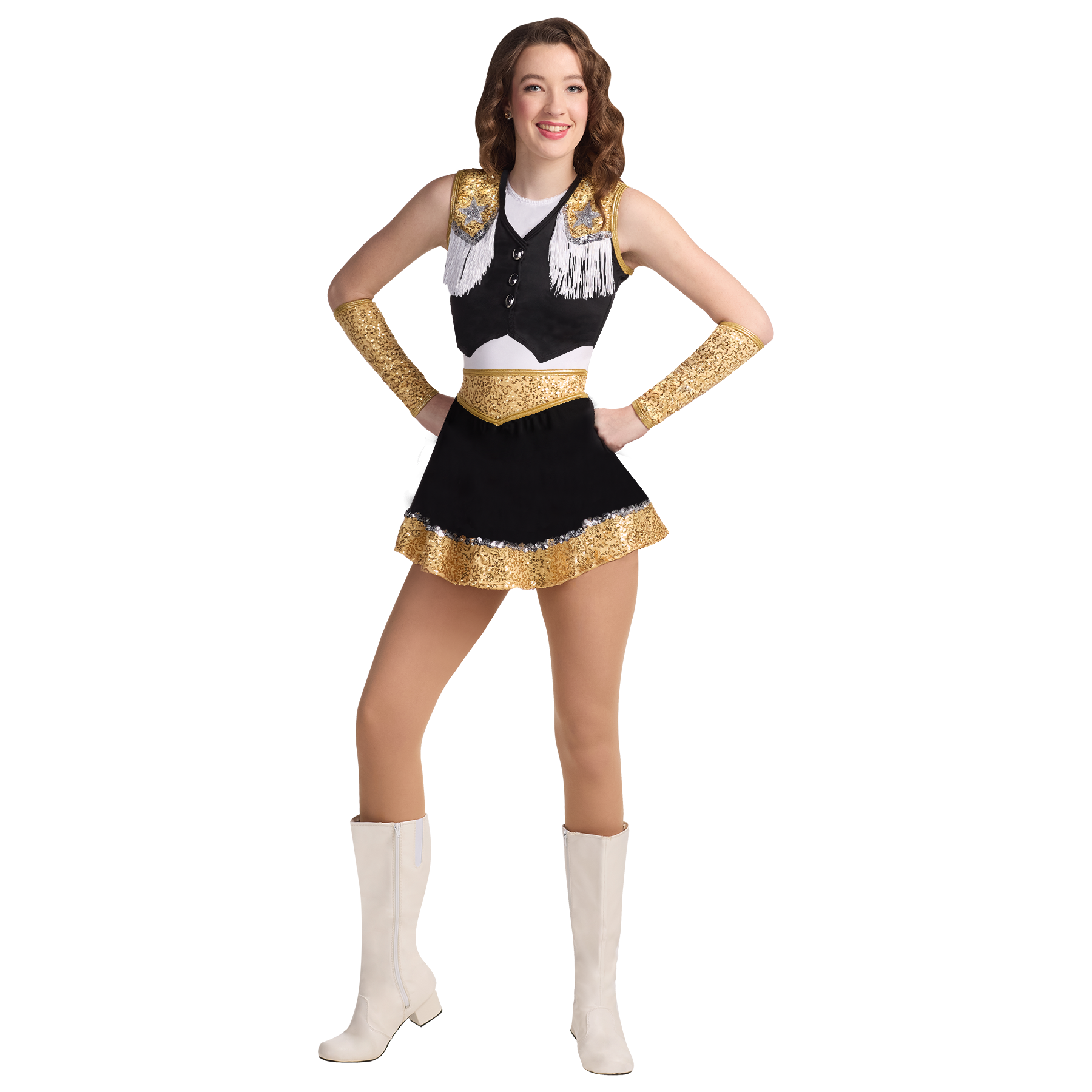 Spandex and micro sequin dress with fringe vest. Dress has zipper back. Buttons and stars always silver. Gloves sold separately.