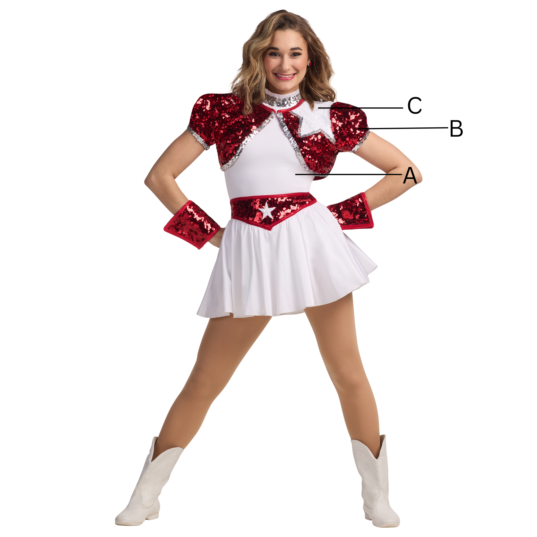 Spandex dress with attached petticoat. Silver star inset on utlra sequin belt. Zipper back. Gauntlets sold separately.